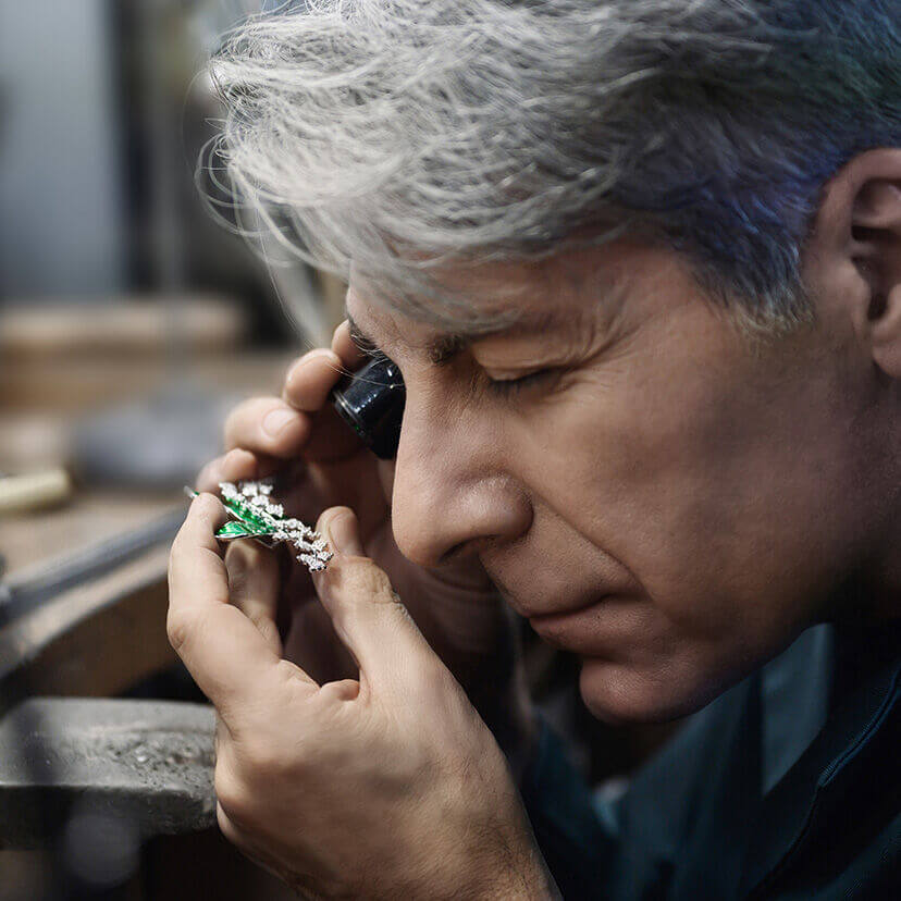 The sprig of lily-of-the-valley, whose tiny bells are encrusted with crystals, and the leaves enamelled in brilliant green, make up the gem. To make it, the first step is to fashion precious metals using a difficult, old technique known as lost-wax casting. The Atelier Truscelli has perfected the procedure, which allows jewellers to cast intricate, single-piece creations down to the slightest details.