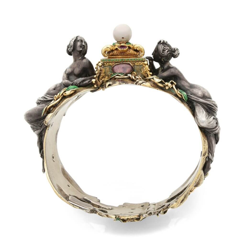 A collection of antique jewellery from the 19th and early 20th centuries will be offered first, including a Neo-Renaissance pomander bracelet set with rubies, exquisite pearls, and enamel by Jules Wièse for François-Desiré Froment-Meurice, valued at €200,000-400,000, based on James Pradier’s work.
