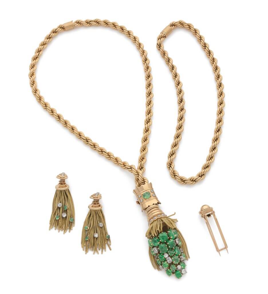 Among the vintage jewels are also of note cornerstone pieces from the 40s to the 70s, such as a stunning retro “Ludo” bracelet by Maison Van Cleef & Arpels, adorned with diamonds and cabochon rubies, estimated at €30,000-40,000, as well as a transformable necklace-brooch set and a pair of earrings by Jacques Lacloche, adorned with diamonds and cabochon emeralds, estimated at €30,000-40,000.