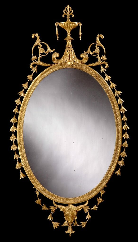 This elliptical giltwood mirror (7173) illustrates the decorative motifs of Adam’s oeuvre, such as the anthemion or honeysuckle at the top which gives way to a Grecian style vase with pendant drapes surrounded by swirling foliates and a continuous strand of campanula or bellflower, leading to the ram’s head at the bottom.