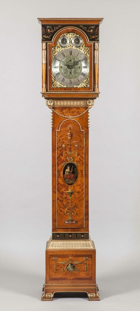 The style established itself in public favour that books containing the designs and furniture of Robert and James Adam, quickly spread to from England to America and France. The influences can be seen in this satinwood long case clock by Maple & Company of London (ref 8560), circa 1880, constructed in a hand-painted and gilt decoration, resembles the ornamentation and designs of Robert Adam interiors, or most carefully to the Etruscan Dressing Room, at Osterly Park.