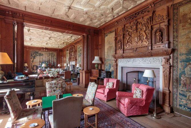 The drawing room is rich in history and features exquisite craftsmanship throughout. The 14th Countess of Dalhousie commissioned John Keeble of London to design this room. The intricate woodwork in this room was created entirely by local craftsmen, and above the fireplace are the crests of the two families associated with Brechin Castle, the Maules and the Ramsays.