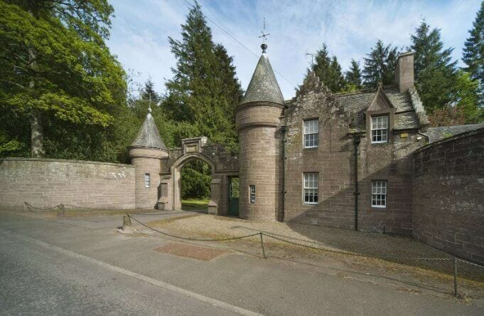 The 1852 Scots baronial-style entrance is flanked by two round towers with conical fish-scale slated roofs. The lodge itself is located to the west of the entrance and includes an open plan kitchen/dining room, conservatory, sitting room, bathroom, and shower room on the ground floor, as well as two bedrooms on the ground floor. The matching tower is used for storage on the opposite side of the entrance gateway. To the rear of the lodge, there is an enclosed garden and two garages.