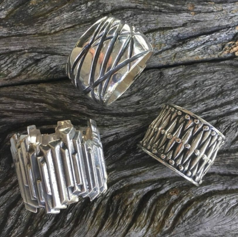 Each piece is hand made with care, attention to process and detail. Cast iron (lost wax), undercutting, embossing on metals by skilled Silversmiths and bronzier workshops.