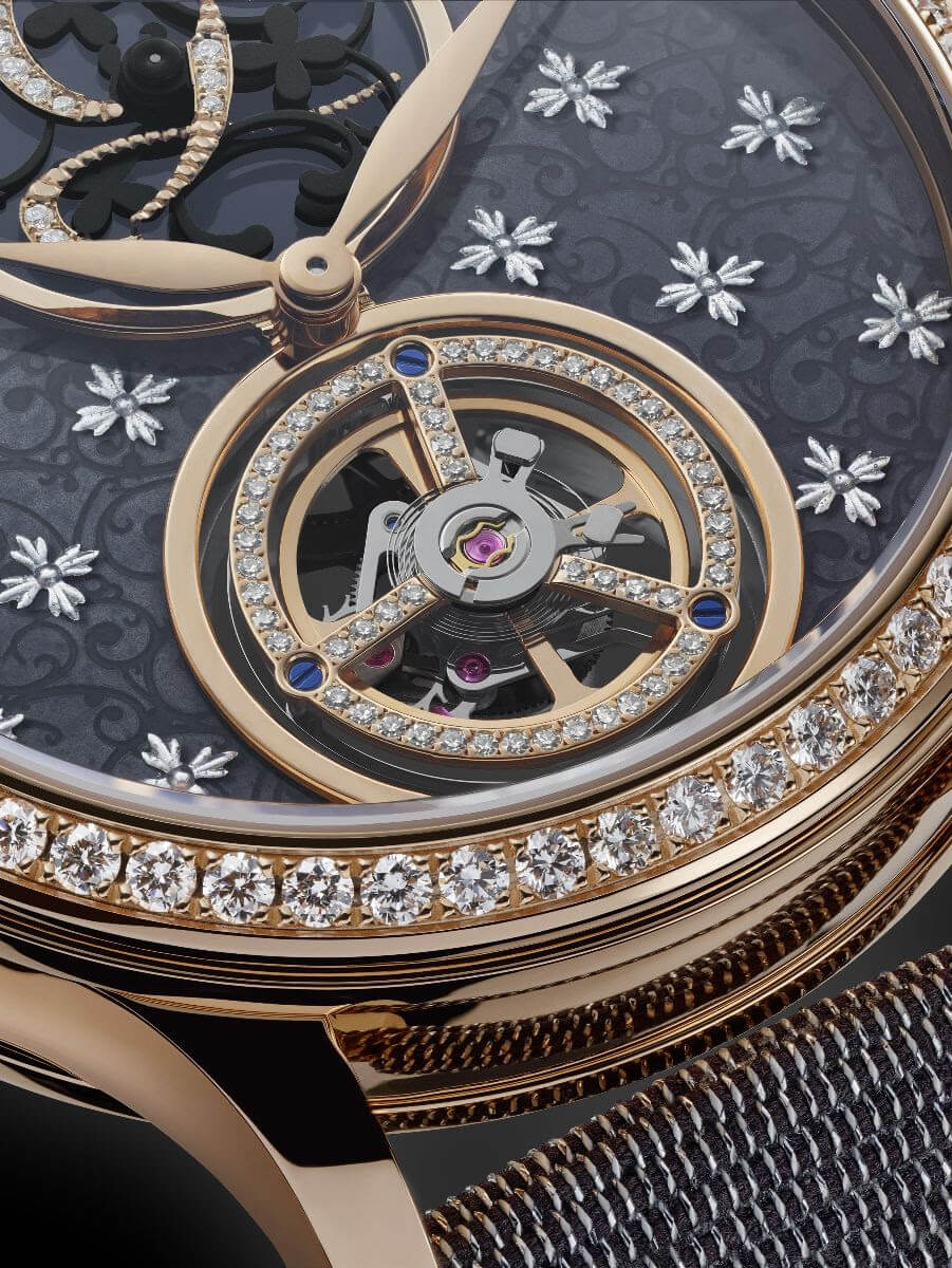 The horological creations by Kerbedanz are infused with powerful symbolism. These messages are conveyed through an artistic interpretation of the cases and dials on Kerbedanz watches. The Tree of Life is a jewellery anthem to immortality, symbolised by the tree after which it is named. With its deep roots and spreading branches, it unites heaven and earth, spirituality and eternity. Framed by a case entirely set with green emeralds that are the colour of life itself, a hand-sculpted gold tree adorns the green enamelled dial. This scene is suffused with the light of sparkling diamonds. These dainty chatons embedded into the gold and enamel are the fruits of the tree, each a token of immortality. Kerbedanz has also decorated the original Technotime base calibre with equally meticulous care. This 41-piece limited series speaks of mystery, life and hope, making the Tree of Life a complete and rare work of art. Movement: Mechanical automatic, KRB-03 calibre, 35 jewels, 28,800 vib/h, twin barrels, 120-hour power reserve.