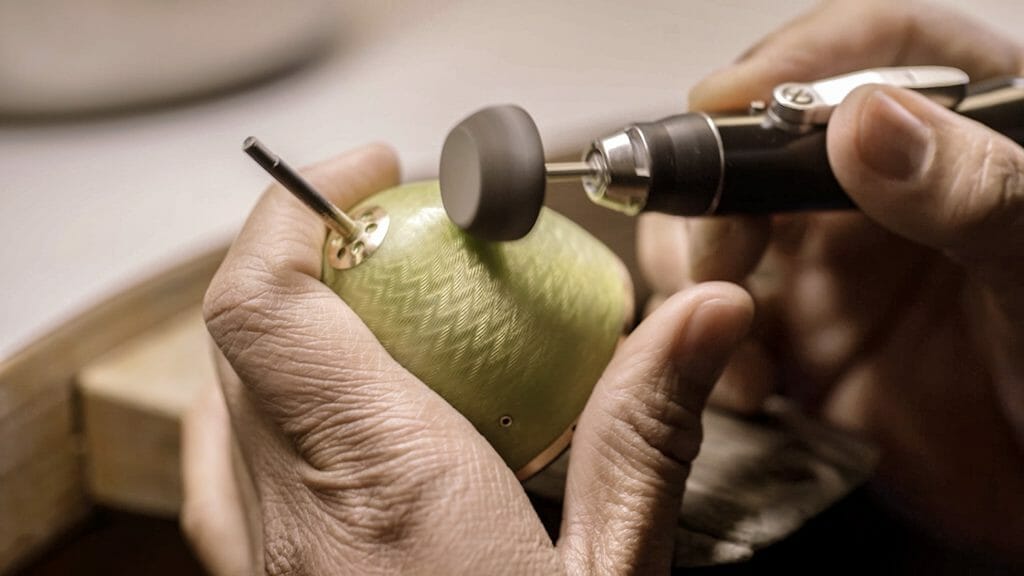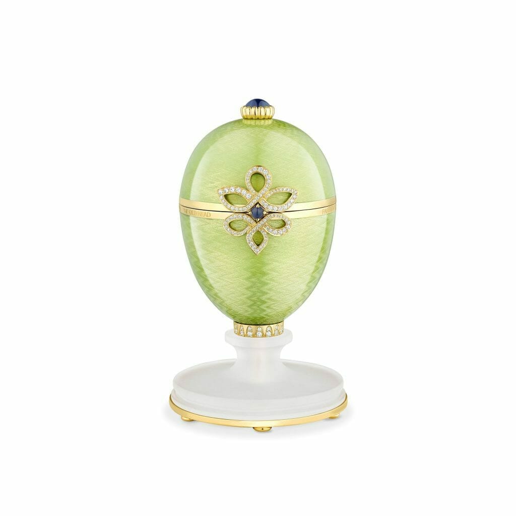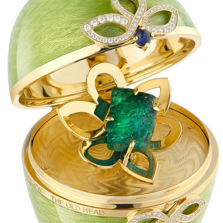 In true Fabergé spirit, a surprise awaits inside in the form of a rough, uncut Zambian emerald, responsibly sourced from Gemfields and presented on a gold guilloché base with intricate claw setting. This is the first time in Fabergé’s history that the Maison has featured a surprise of this kind. It invites collectors to further customise the creation by commissioning Fabergé to convert the beautiful rough emerald as part of a bespoke set or piece of jewellery.